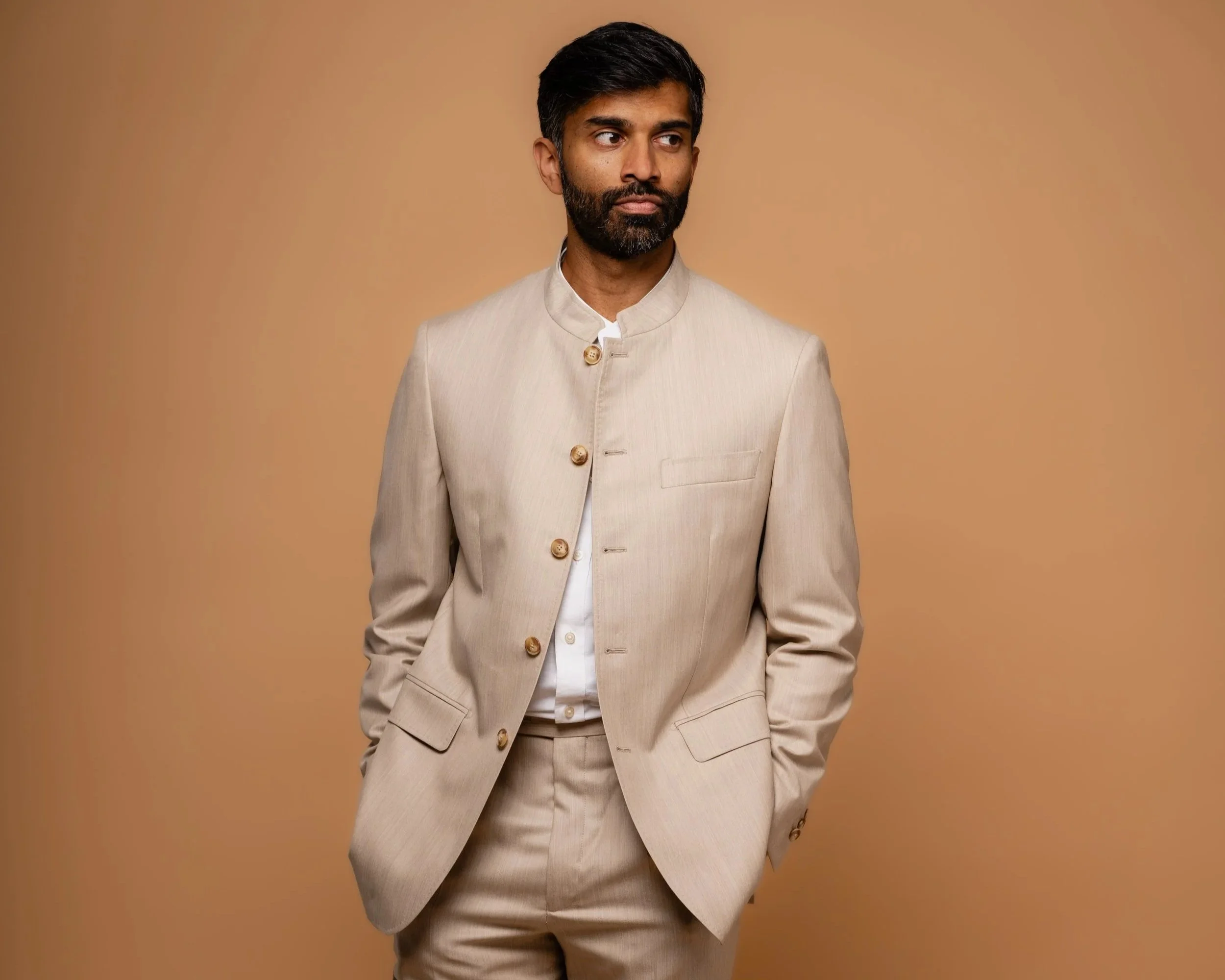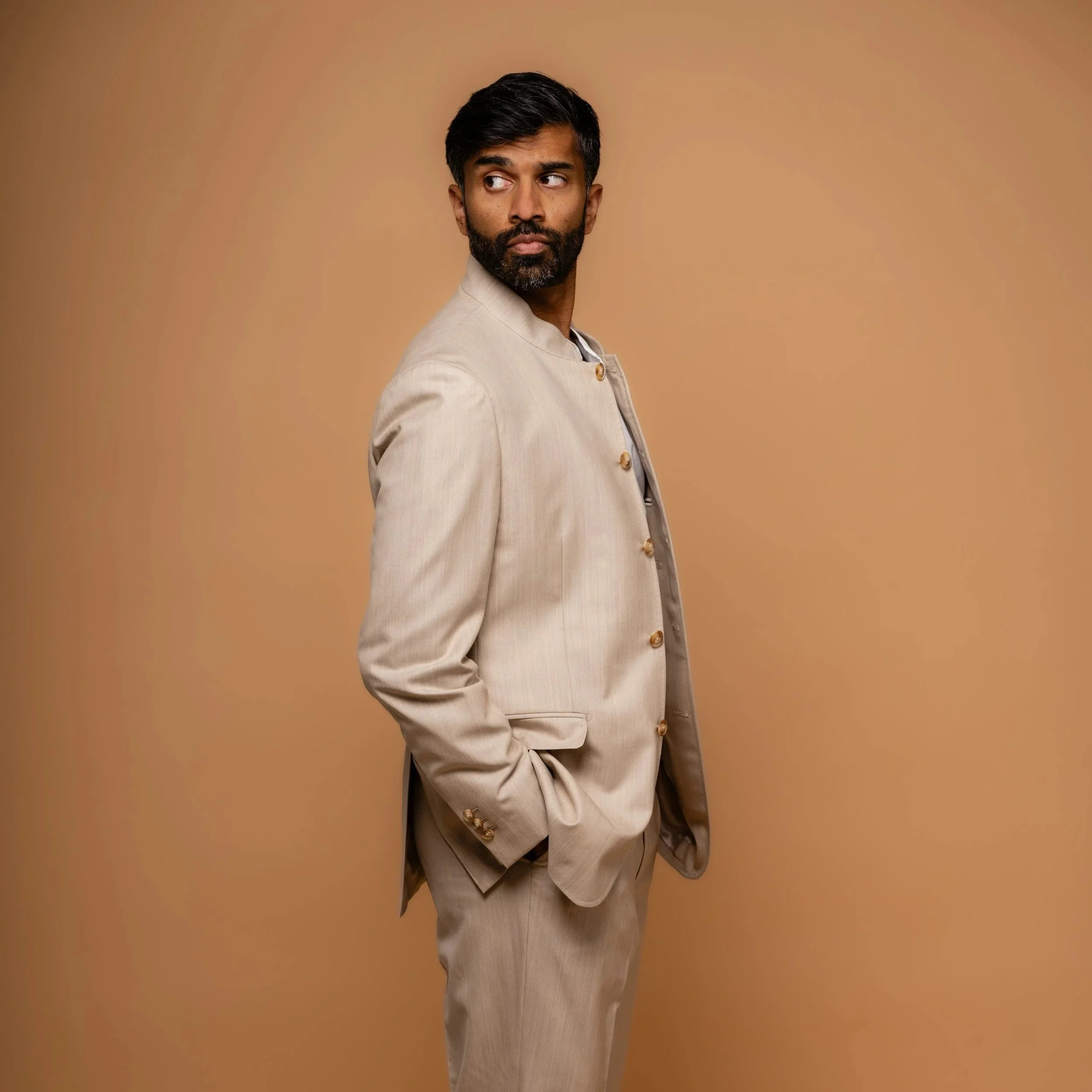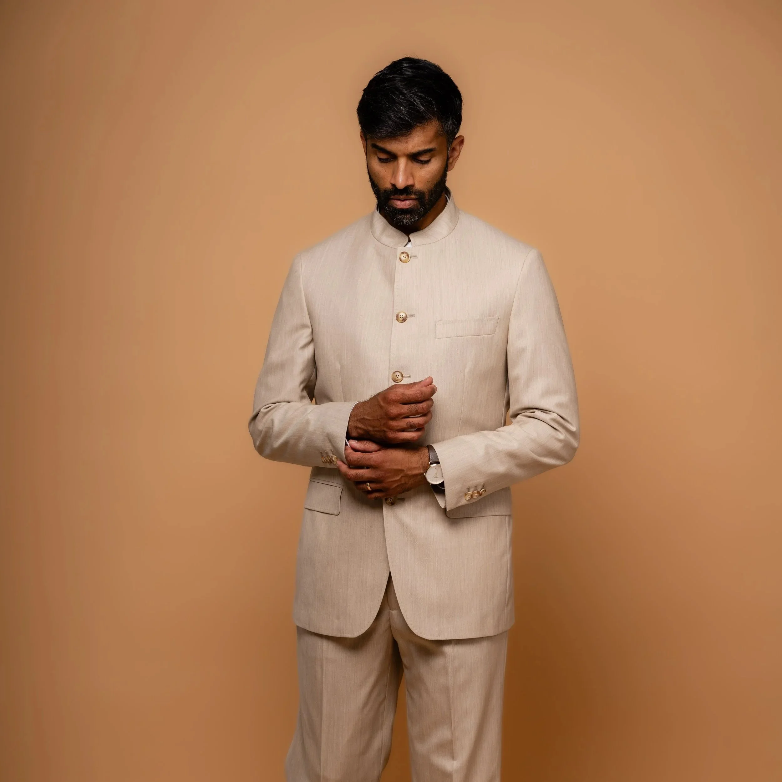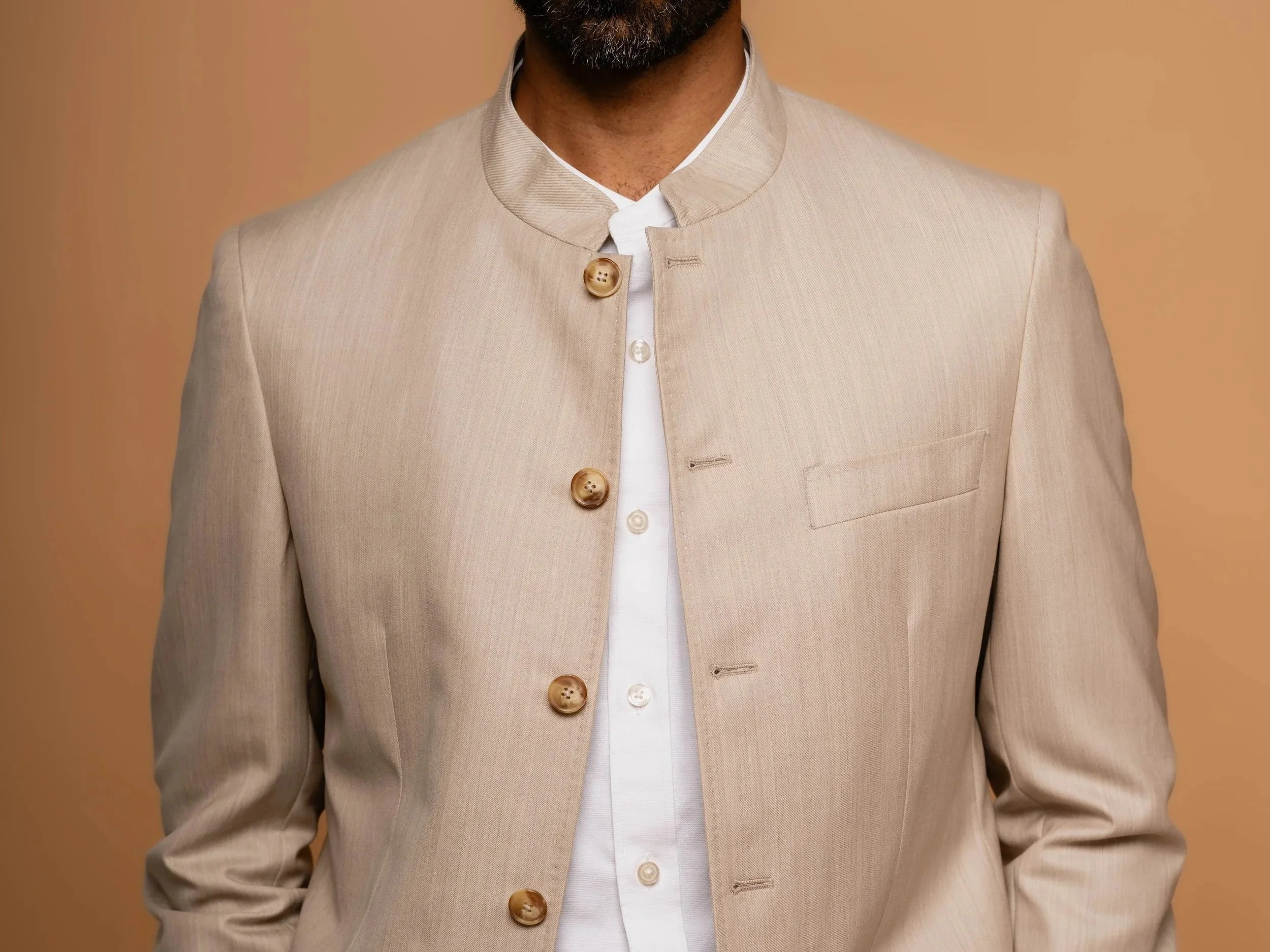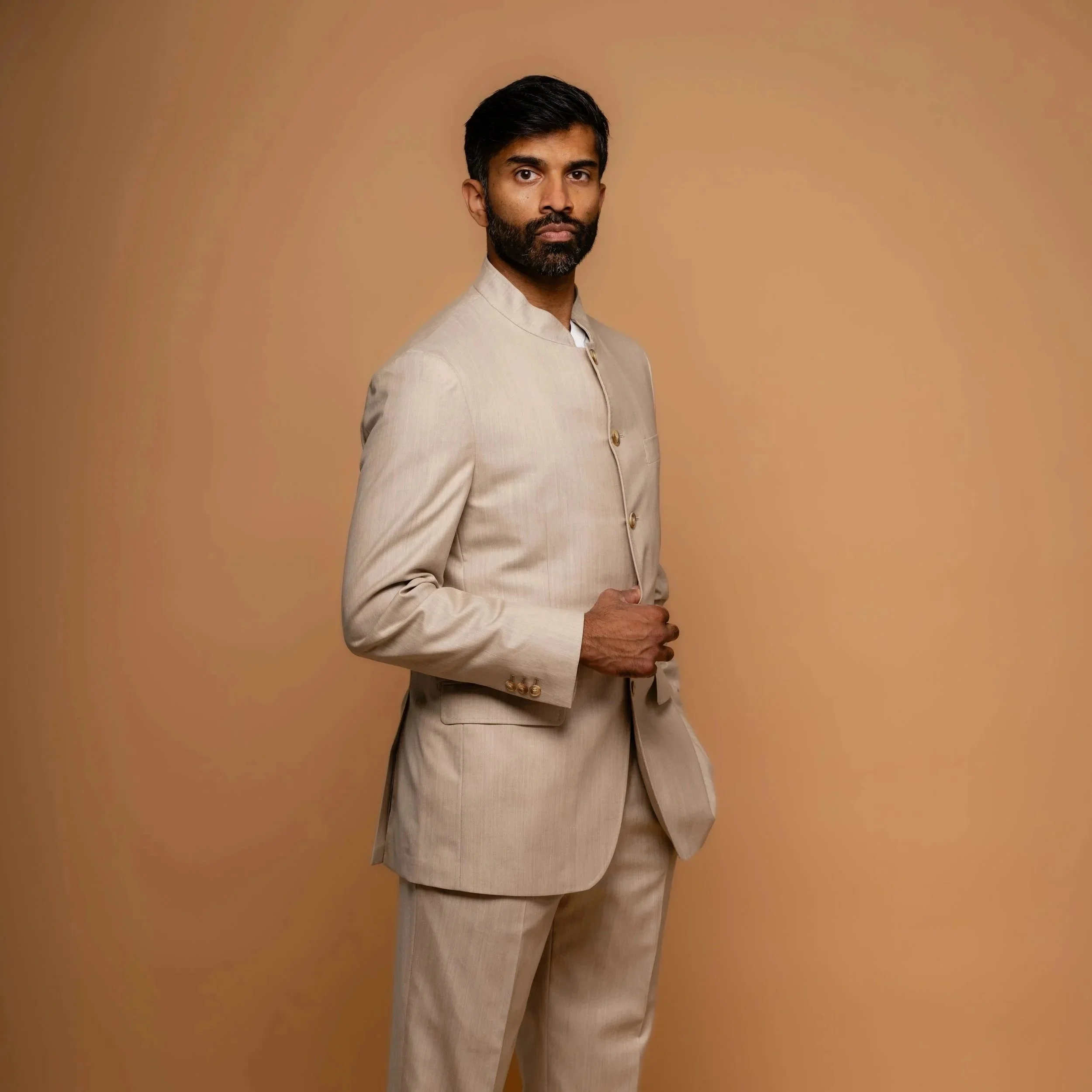 A blend of East and West - the Sprezza Indus Collar Jacket pays homage to the centuries of princely sartorial tailoring of South Asia. This is a timeless look for gents that want to make a statement. The half canvas jacket with the distinct stand-up collar is a sleek alternative to a lapel suit and is structured enough to be dressed up (or down). The soft shoulder and five button jacket makes this a good choice for all occassions.